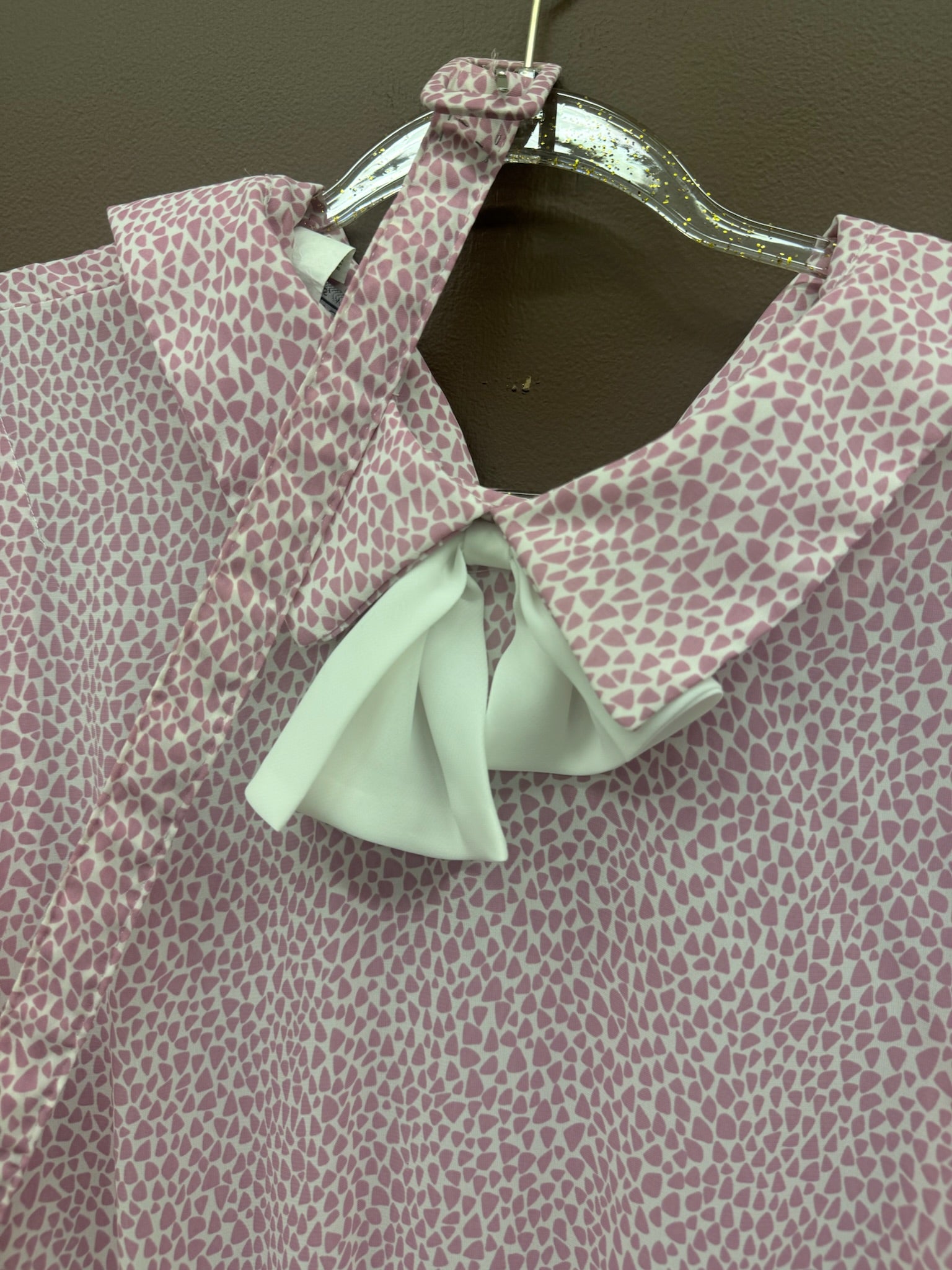 Adorable 1980s speckled mob dress with matching belt and bow collar detail. Approximately size medium.