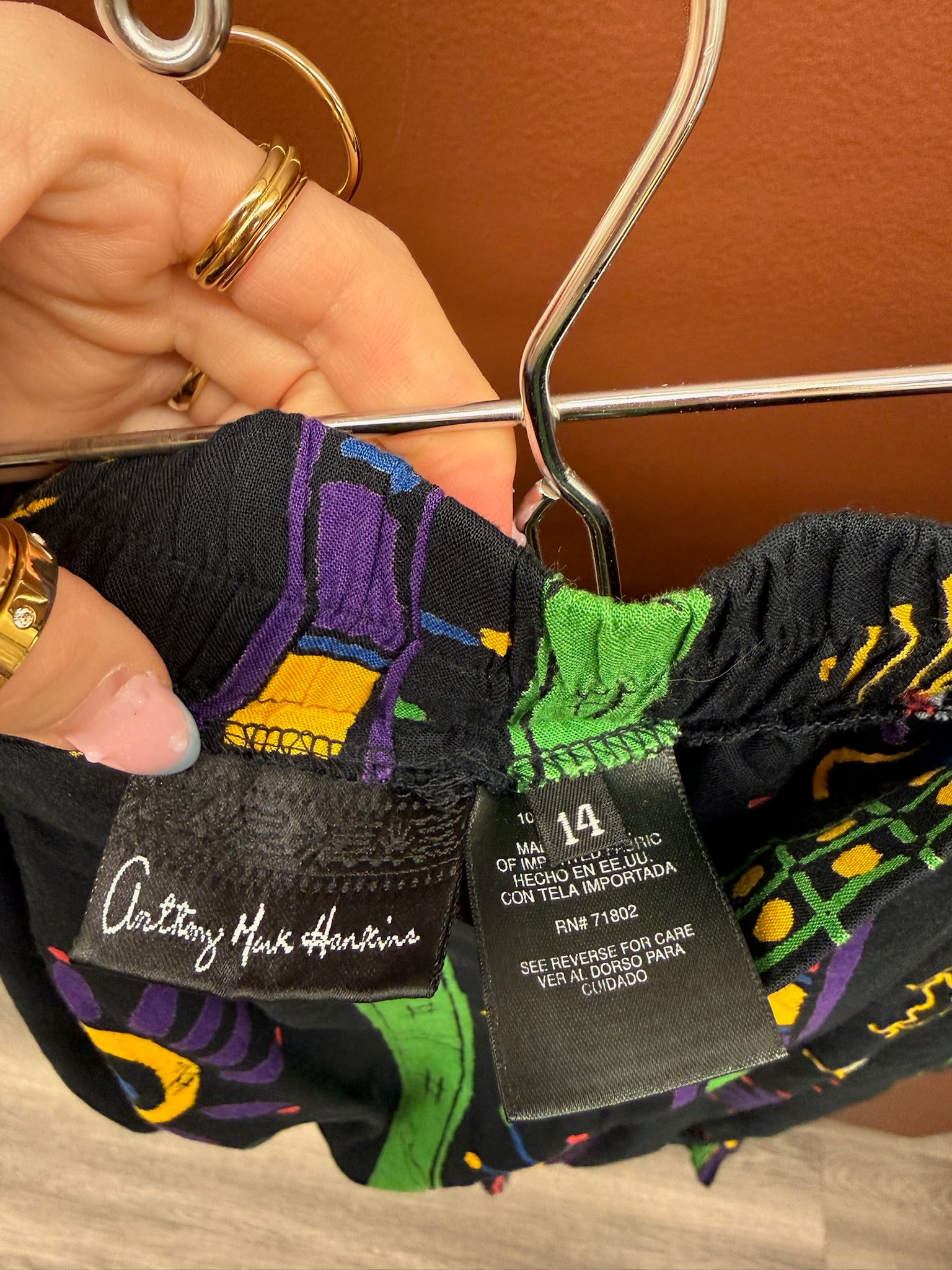Abstract print elastic pants in the 1990s art to wear style.