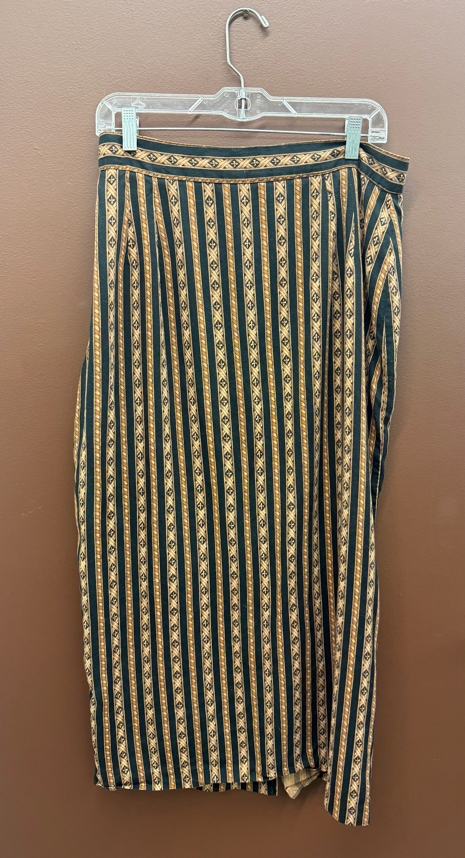 Brown and black women’s skirt with geometric print and stripe design.