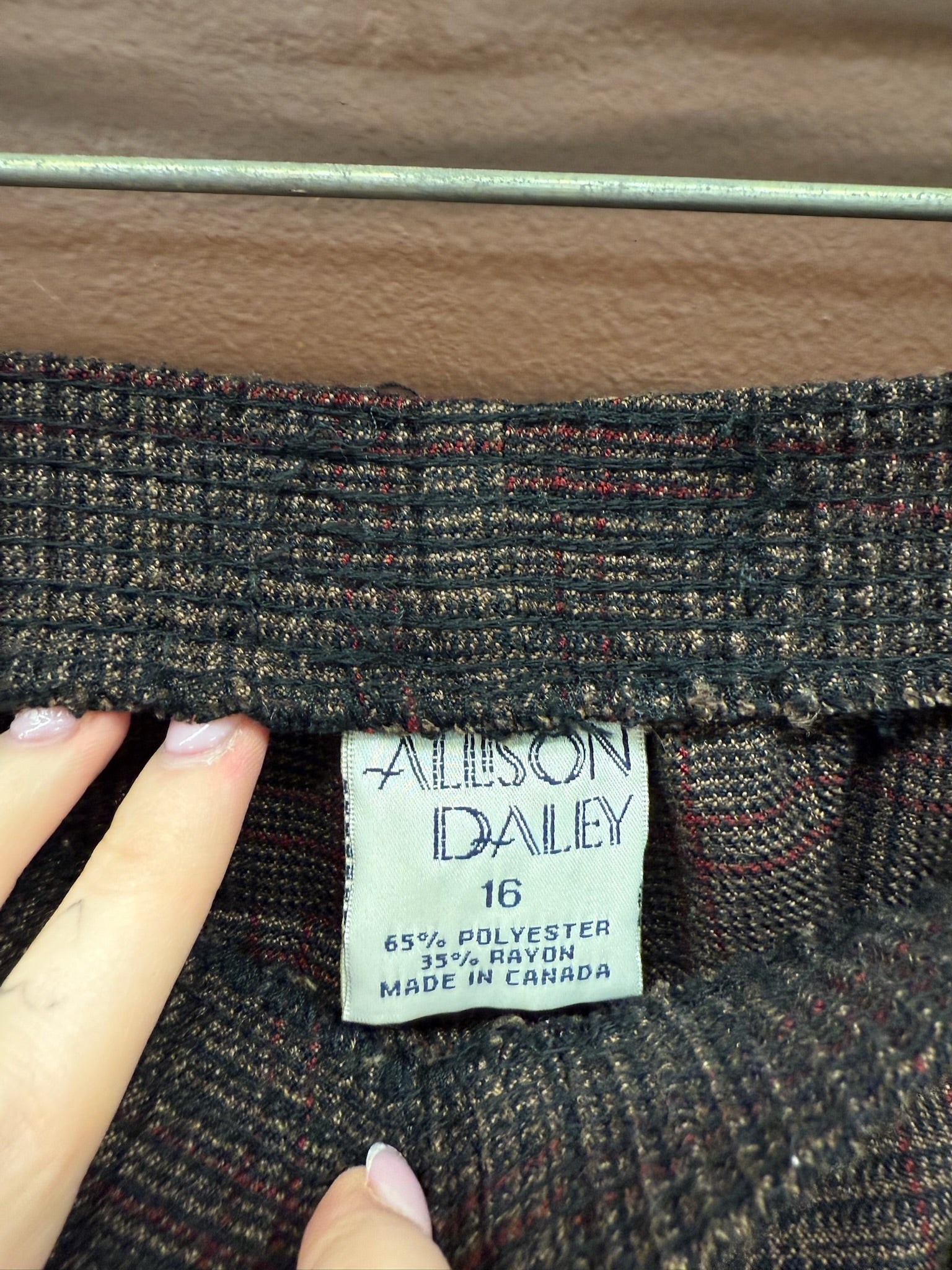 Women’s brown and black elastic waist checkered trousers.