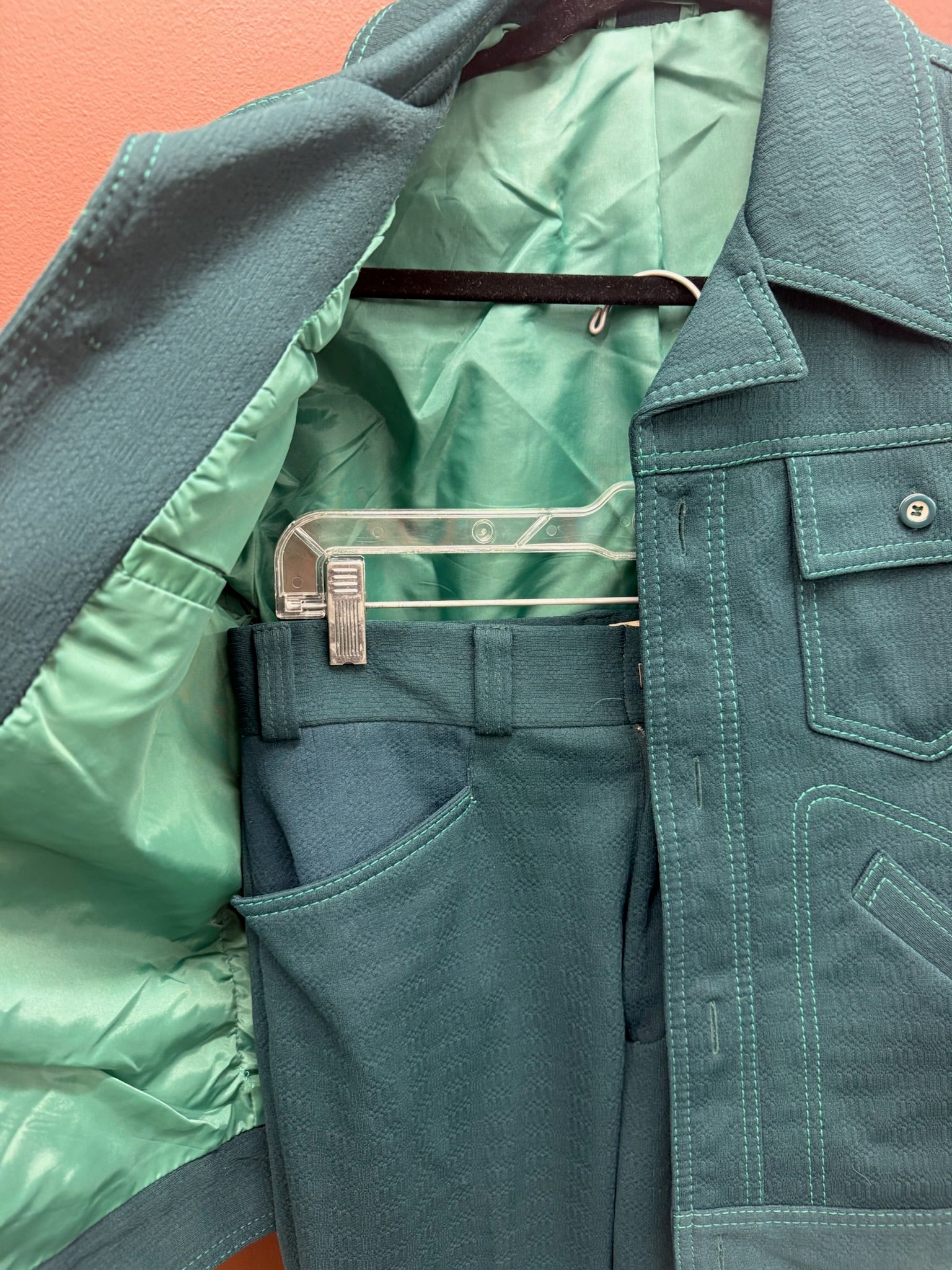 Amazing men’s emerald green leisure suit set with stitching detail. Approximate size small.