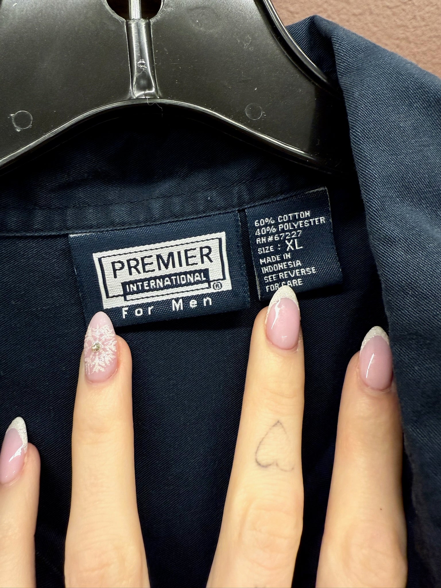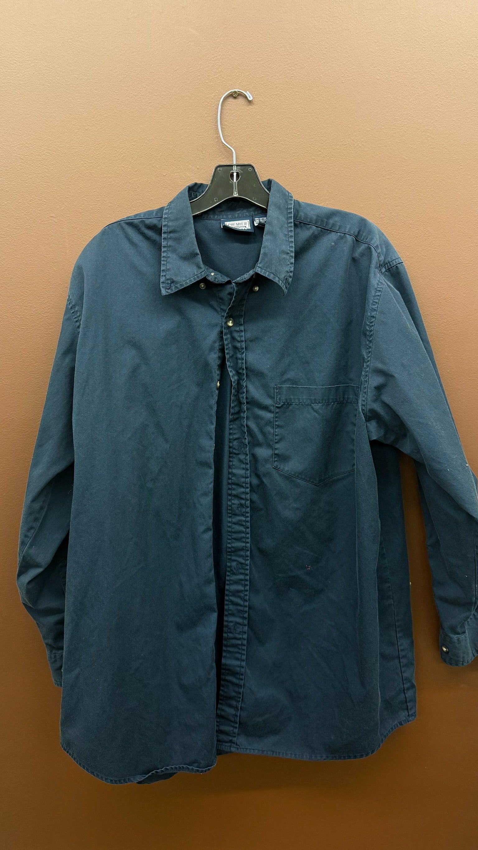Men’s navy long sleeve button up with pocket.