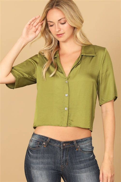Olive green short sleeve satin button up shirt.