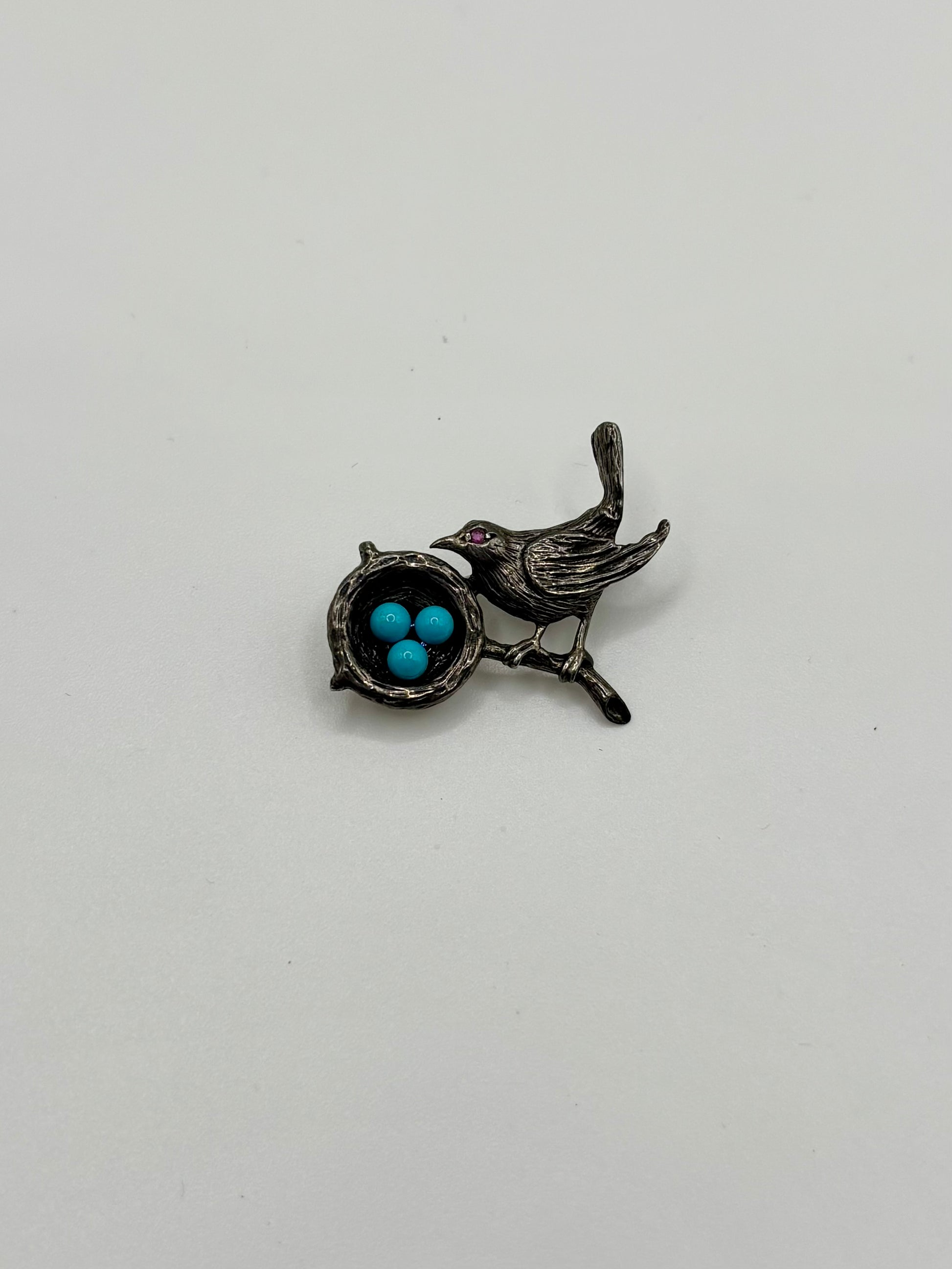 Small silver brooch pin with bird design and turquoise colored eggs
