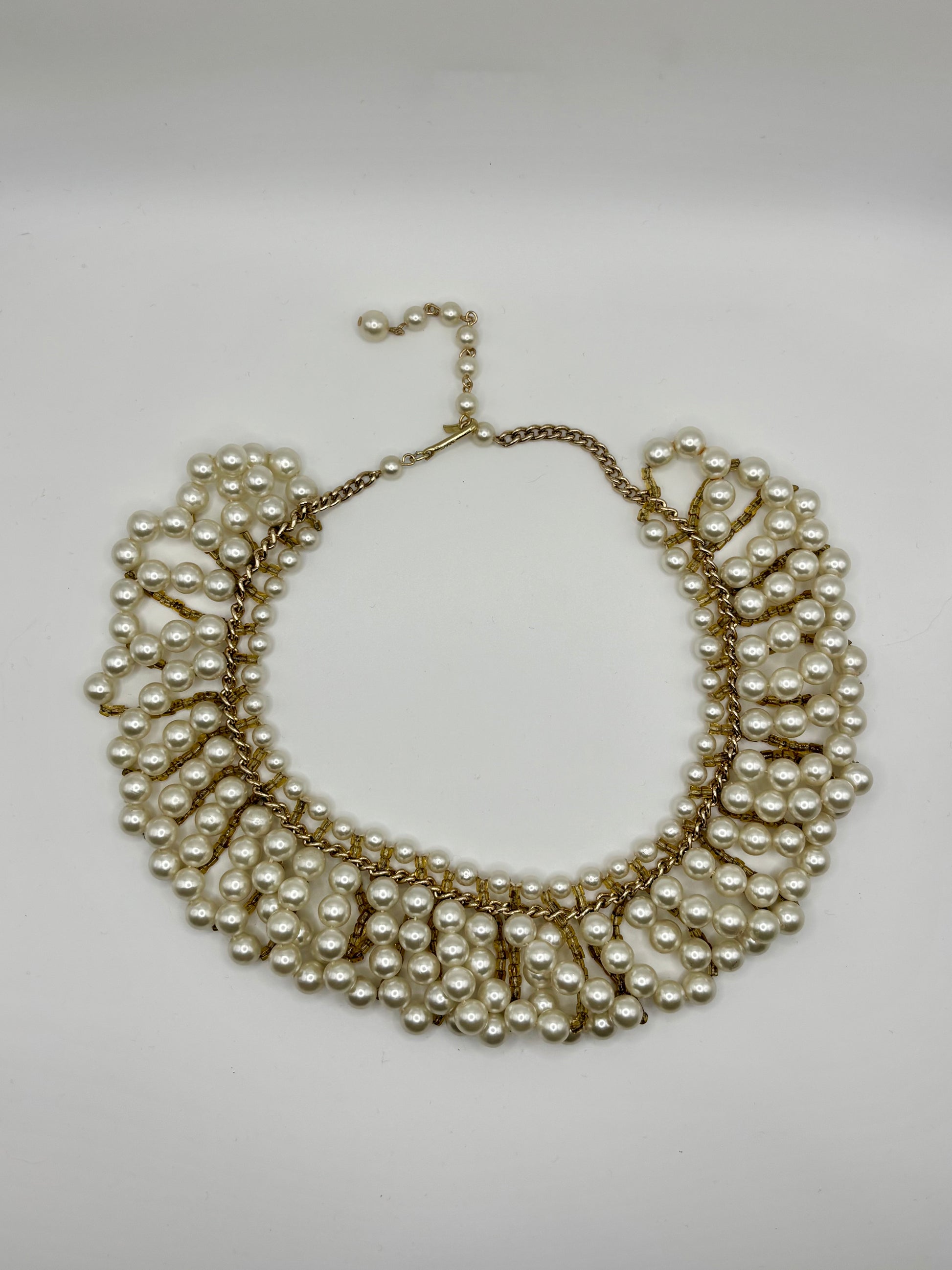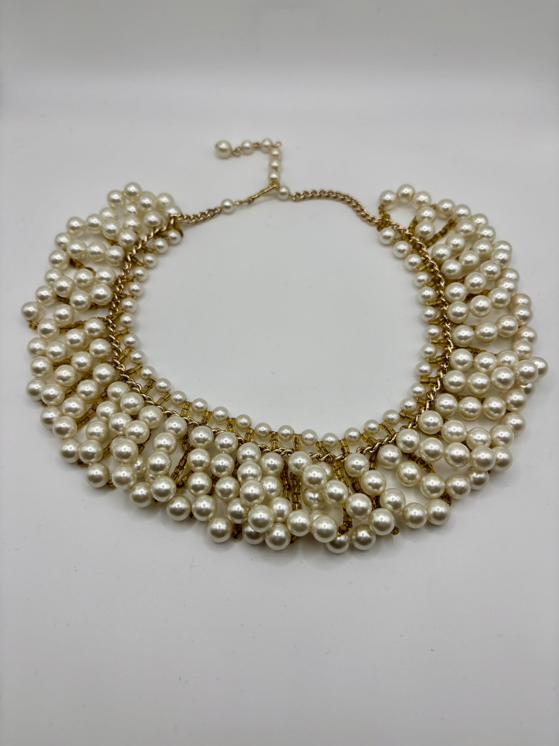 Stranded collar design necklace made of gold tone metal and faux pearls.
